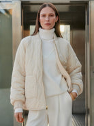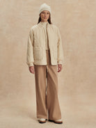 This reversible layer is comprised of Bouclé Sherpa on one side and Varley's Crinkle Shell fabric in quilted design on the other. It has a boxy fit and chunky knitted cuffs and collar.