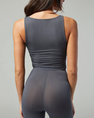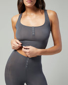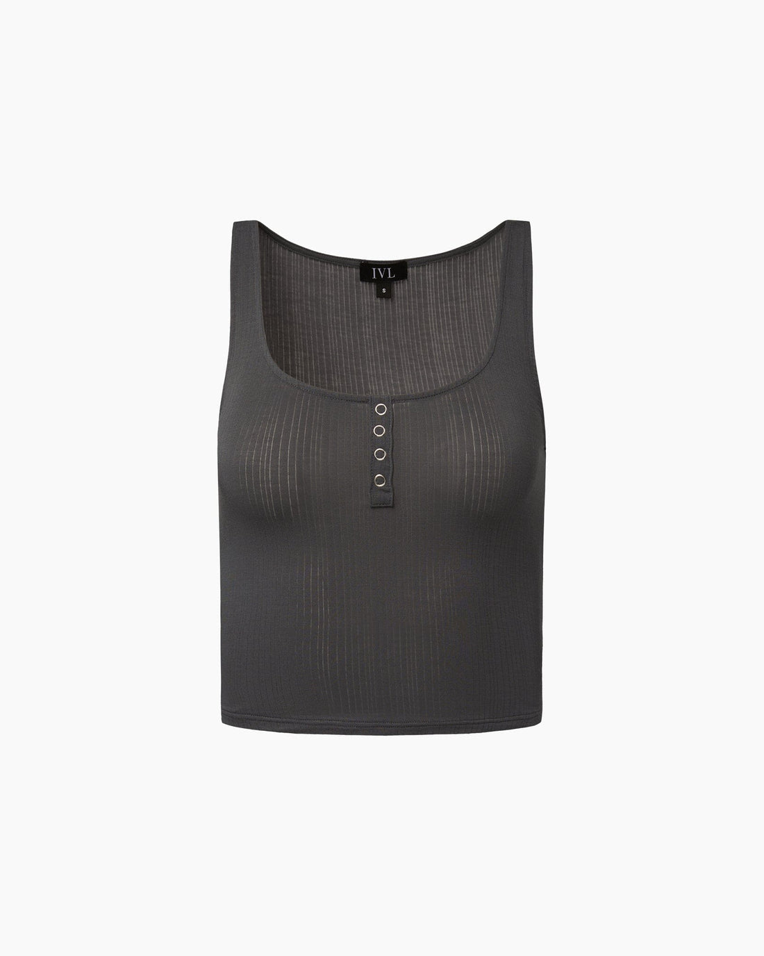 The Rib Lounge Tank is a great cropped tank made of a sheer, ribbed fabric. The faux snap buttons up the front add a cute detail to elevate the look.