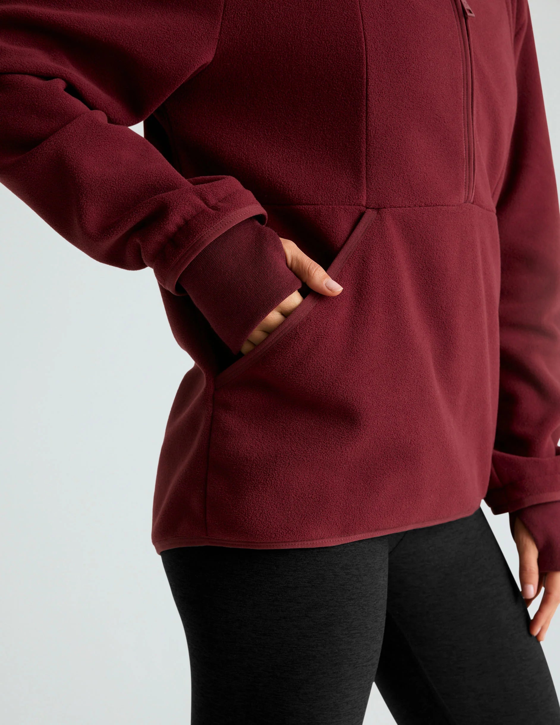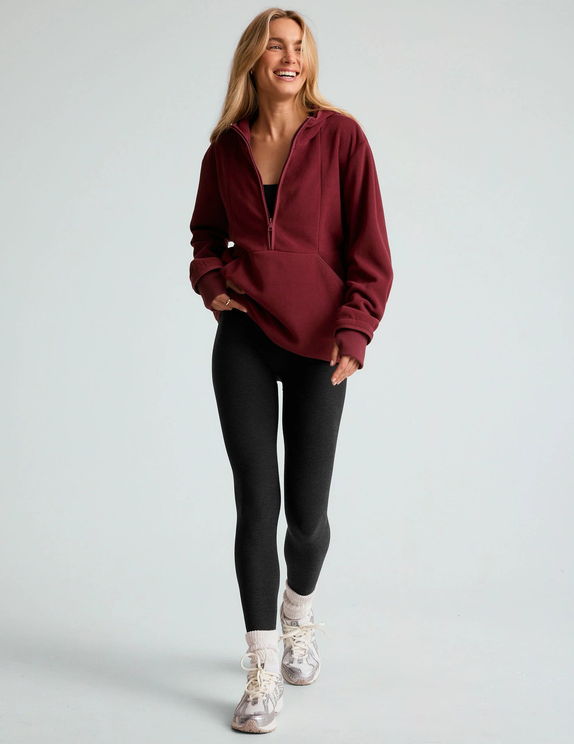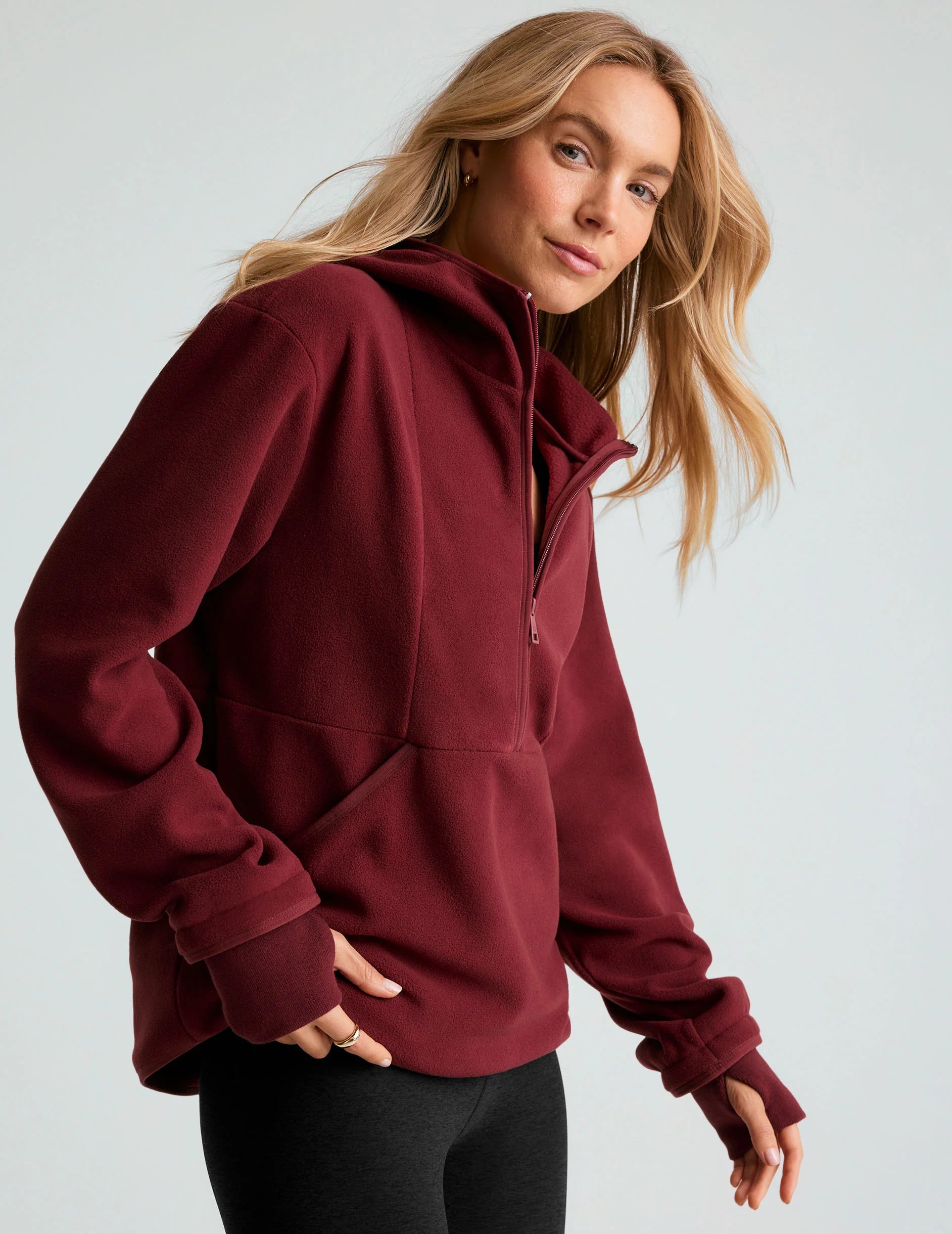 This fleece half-zip pullover is perfect for transitioning between seasons. It’s a cozy layer for lounging at home or a great addition under your favorite jackets when winter arrives. Featuring a hood and kangaroo pockets, it combines comfort and practicality effortlessly.