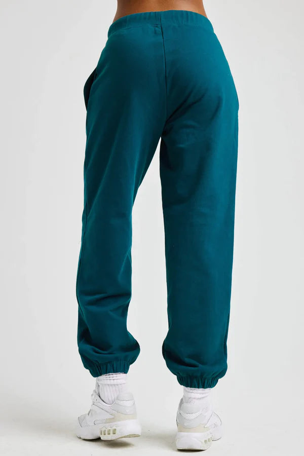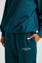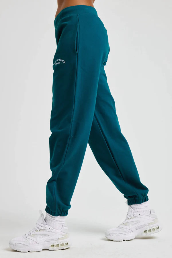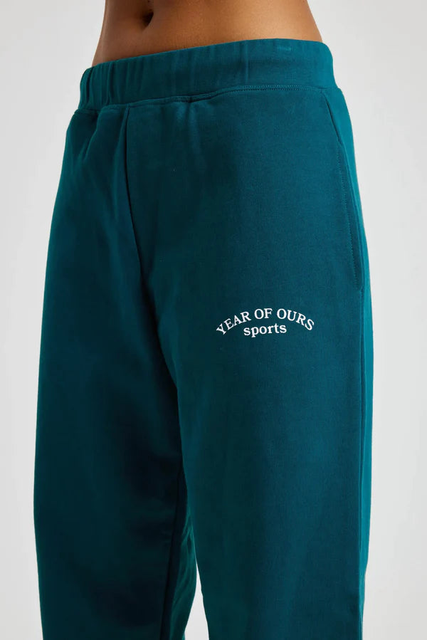 Introducing a comfortable and relaxed fitting sweatpant, perfect for changing into or wearing on off days. These sweatpants feature an encased elastic rib waistband with elastic at the leg opening. The Year of Ours Sport screen print is located on the left leg. Pockets are conveniently placed at the sides, and there is a drawstring at the inside waist for added adjustability. The sweatpants are made with a soft loop French Terry inside and a smooth surface on the outside. The heavyweight fabric is easy to wash and remains clean. For a matching set, pair the sweatpants with the YOS Crew Sweatshirt.