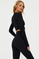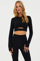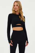 The Francine top is Beach Riot's new performance waffle tee that's lightly compressive, sweat wicking and allows you to stay cool during a workout but warm when you head back outside. It features a long-sleeved design with a cutout detail at the front, thumbholes at the cuffs, a crew neckline, and soft waffle-textured fabric