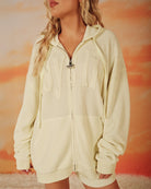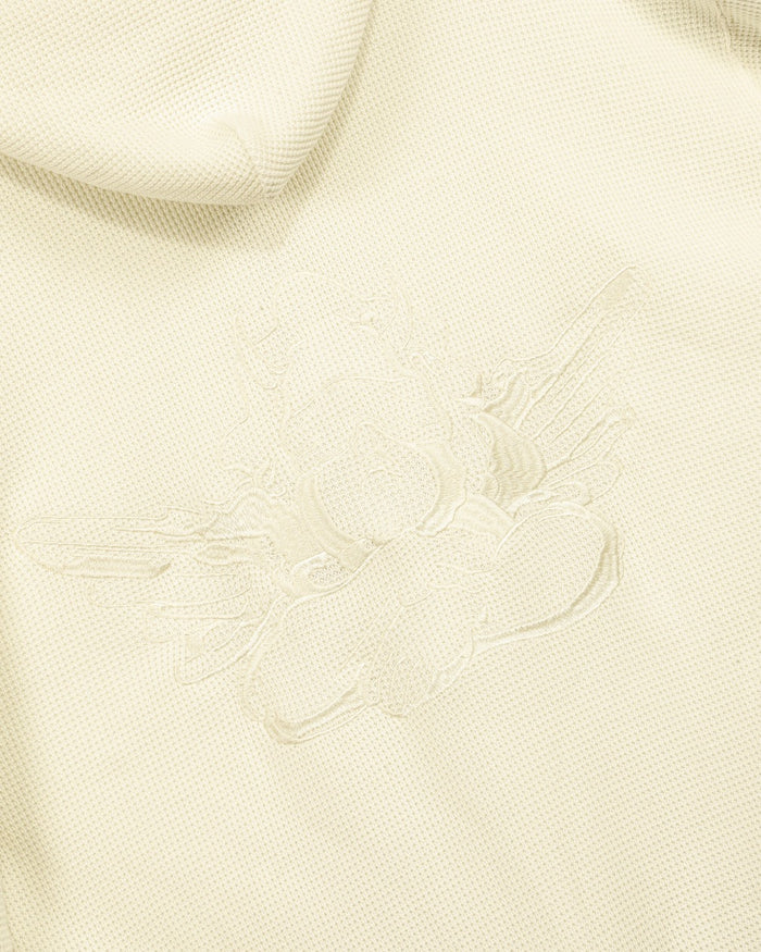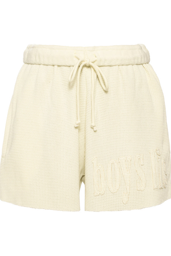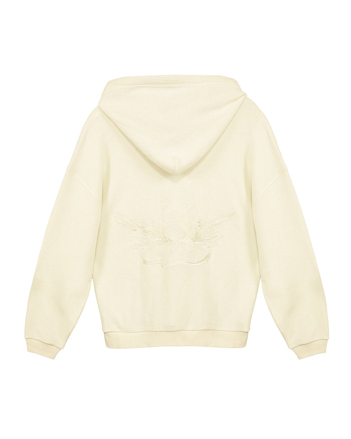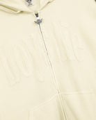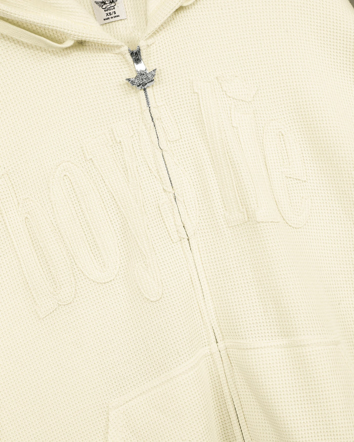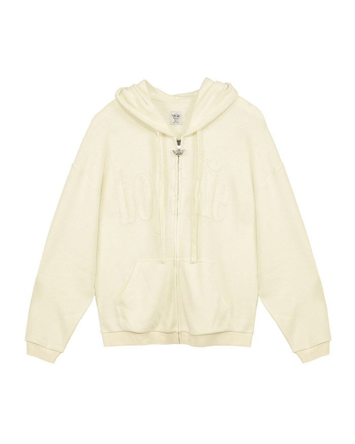 Made from soft, cozy waffle knit fabric, this butter yellow zip up has a relaxed fit that feels comfortable and laid back. "Boys Lie" is stitched across the front in the same shade for a clean, subtle look, and a matching cherub design is stitched on the back.