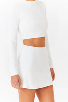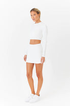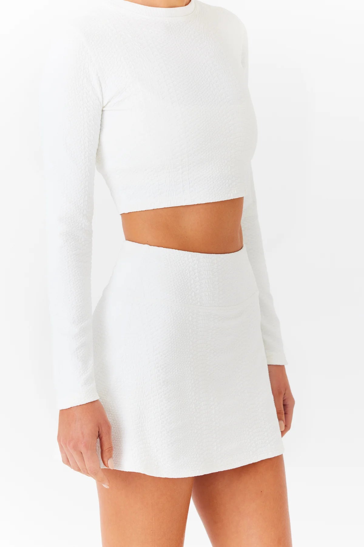 The Quinn Top is perfect for your early morning tennis game. Crafted from our super soft textured faux snake, this long sleeve crew neck top features a fitted, cropped silhouette, and is designed to pair perfectly with the Ava Legging and Heidi skirt.