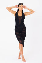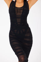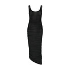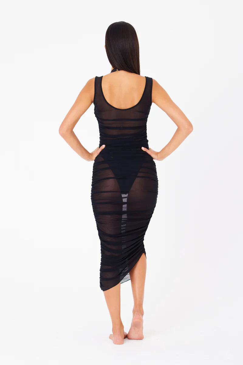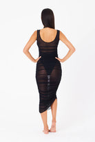 This dress is made in a silky soft, sheer, fine mesh fabric. Its asymmetrical hemline and gathered body complement your gorgeous figure. A sleeveless, midi-length dress with delicate baby merrow hemming, scoop neck and low cut back completes this timeless beauty!