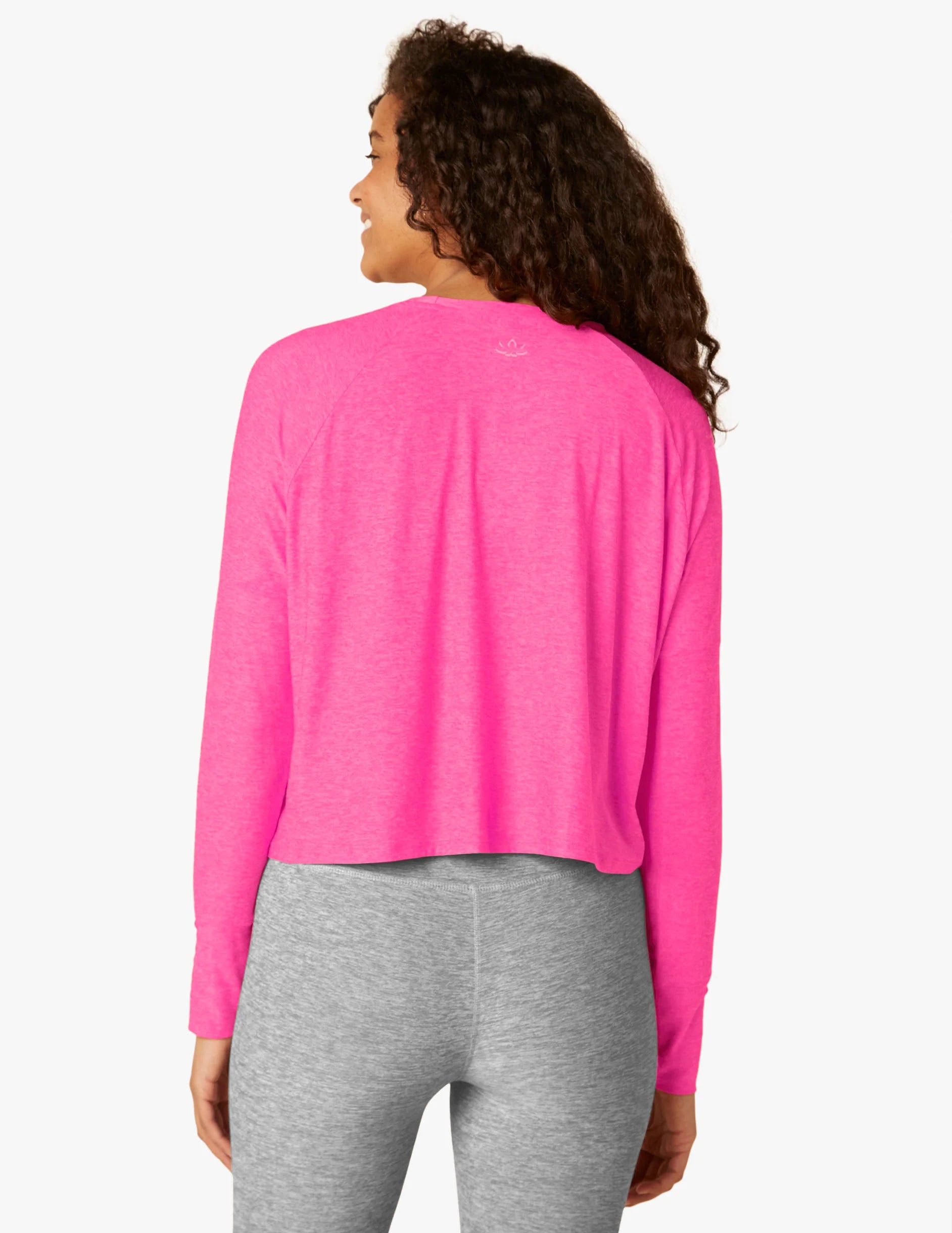 Super soft and breathable, this always-on-hand long sleeve tee is built to last. It's made with a buttery-soft jersey knit fabric that's the perfect weight for layering or wearing on its own. It features raglan shoulders and a high hip length that accentuates your figure. And since it's crafted with a flattering scoop neckline, you can wear it with anything from leggings to distressed denim shorts.