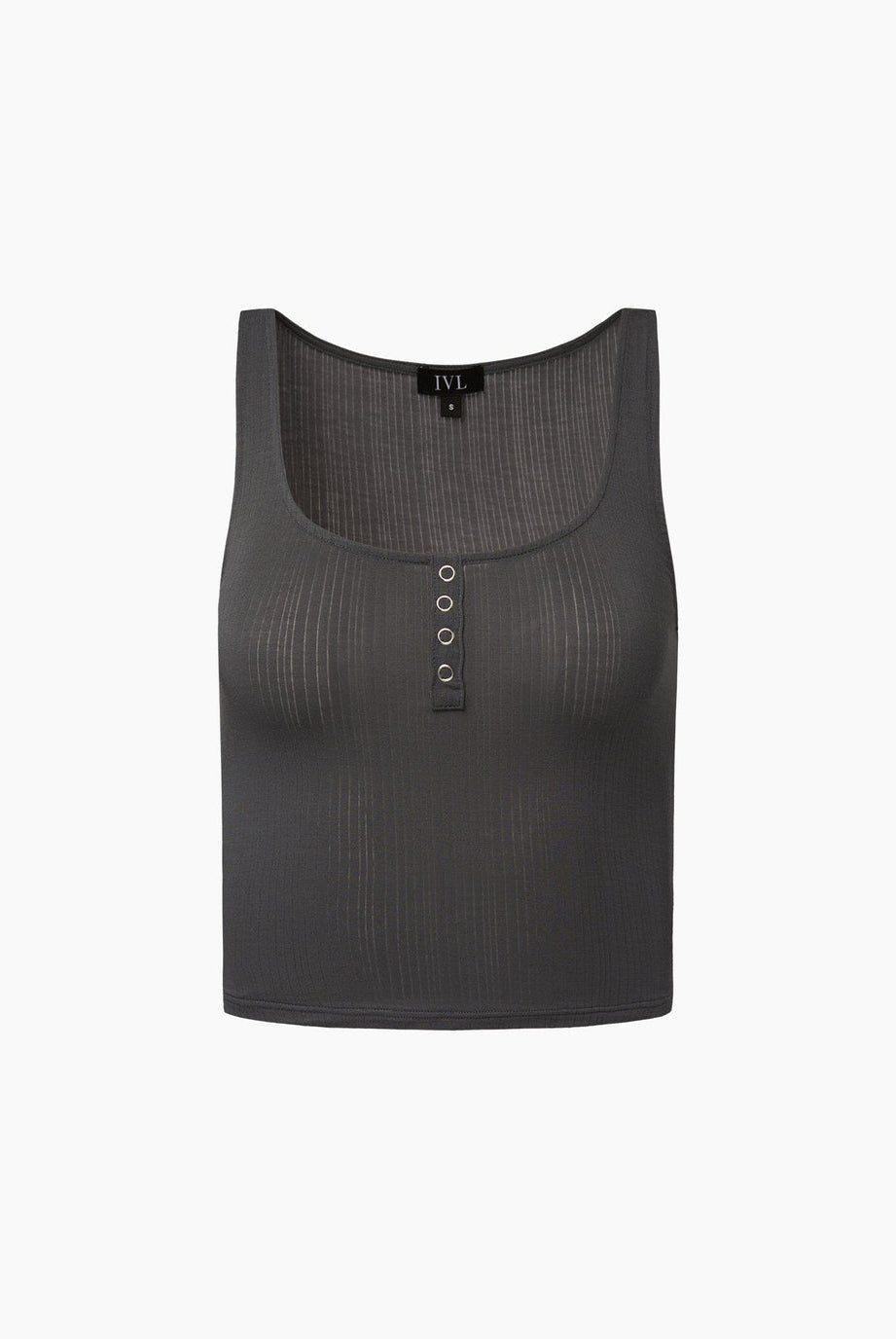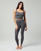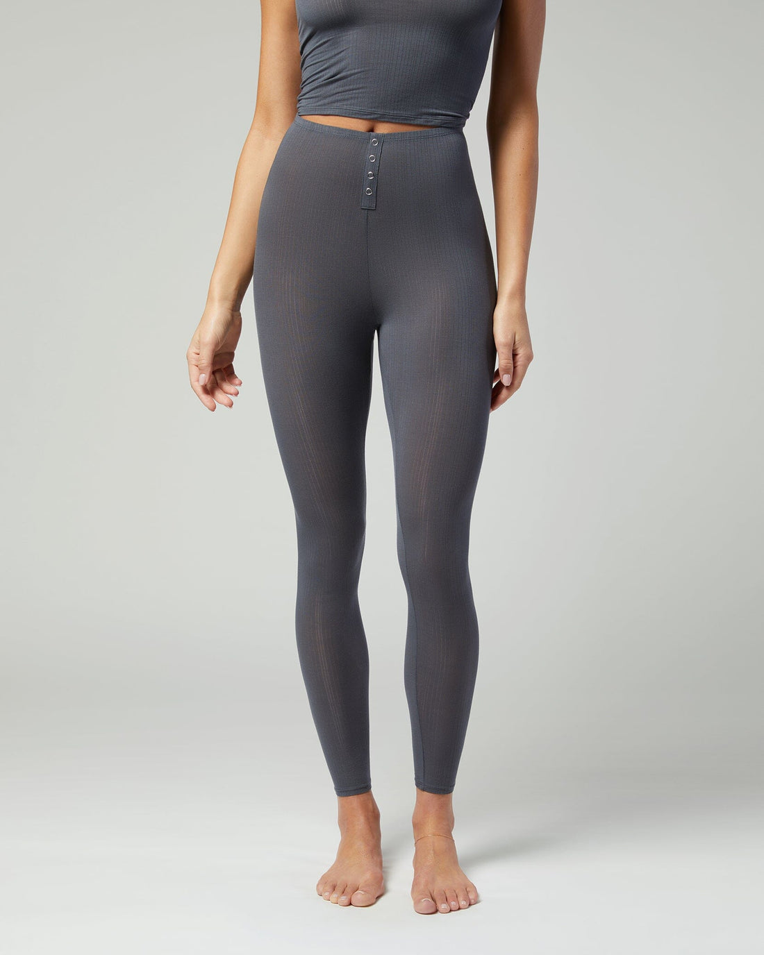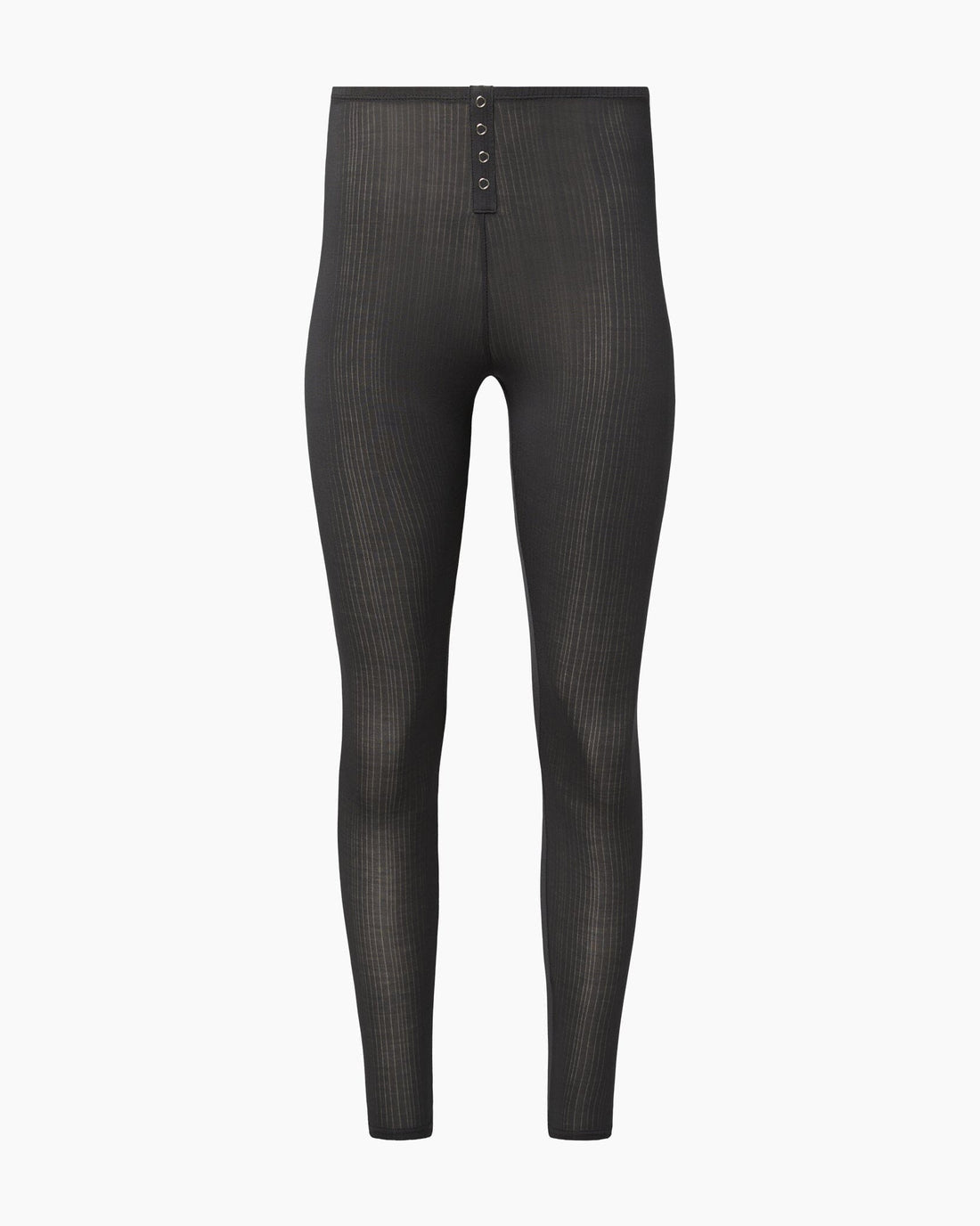 The Rib Snap Front Legging is made of the same sheer ribbed fabric with a matching snap-front detail up the high-rise waistband.