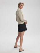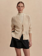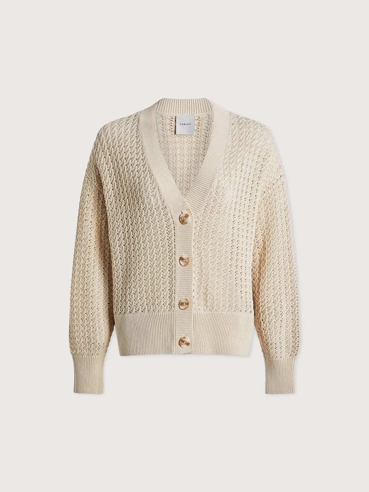 The Astell is a cardigan reinterpretation of the Delaney knit vest, made from 100% cotton in a twisted pointelle stitch that gives it a richly textured, open-knit look—ideal as a standout layering piece. Delicate contrast embroidery along the side seams adds an extra touch of detail and craftsmanship.