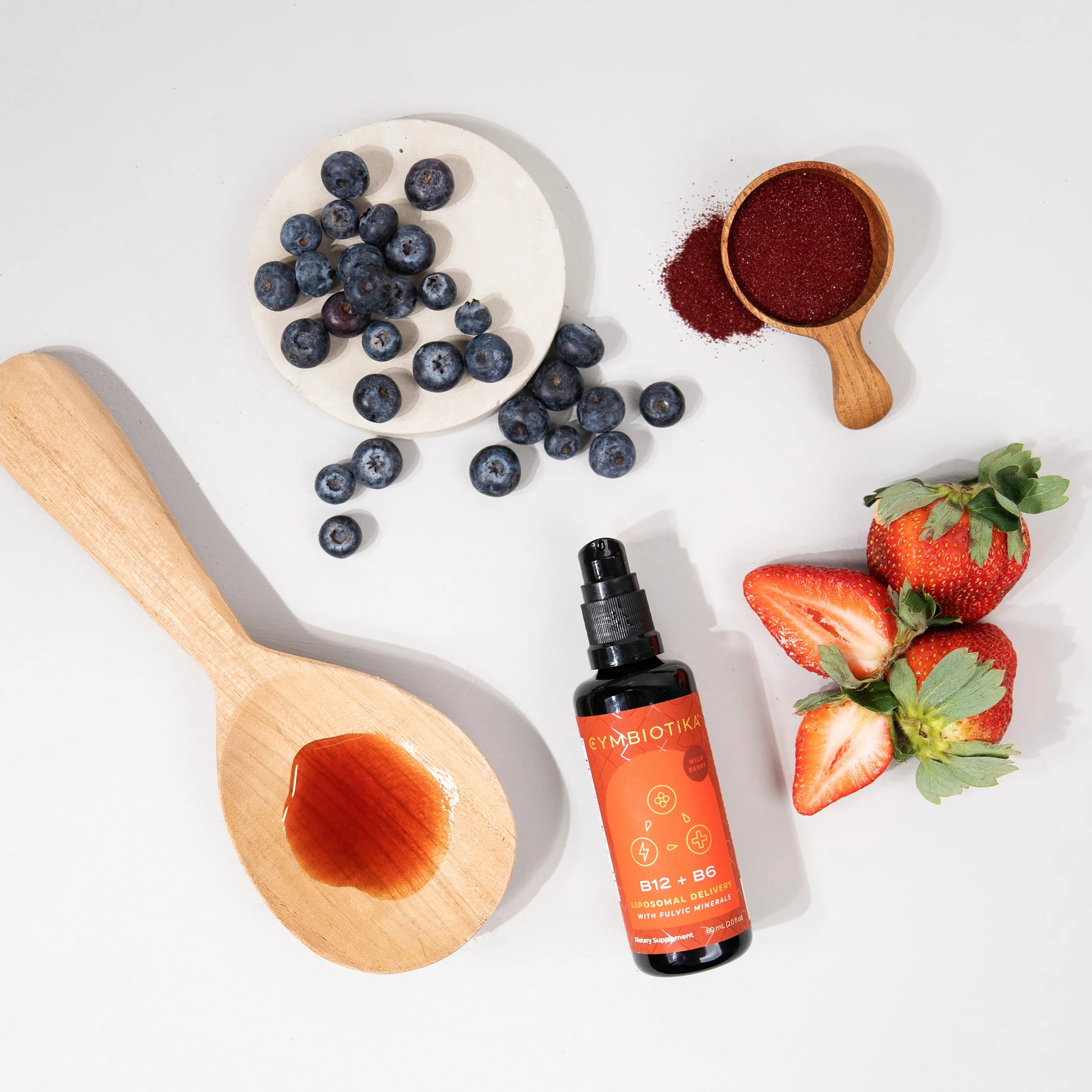 Cymbiotika's B12 + B6 supplement is a natural mixture of the most bioactive forms of Vitamin B12 - Methylcobalmain, Adenosylcobalamin, and Hydroxocobalamin Chloride - along with Vitamin B6 (Pyridoxine HCI) and L-Methylfolate (folate), a key vitamin for methylation and cellular detoxification. Vitamin B12 aids in red blood cell production, mood regulation, memory enhancement, cellular energy support, and heart and bone health. This advanced liposomal technology enhances absorption and bioavailability of the entire formula.