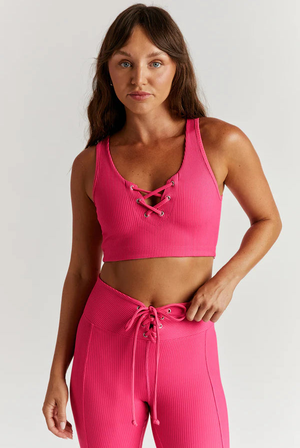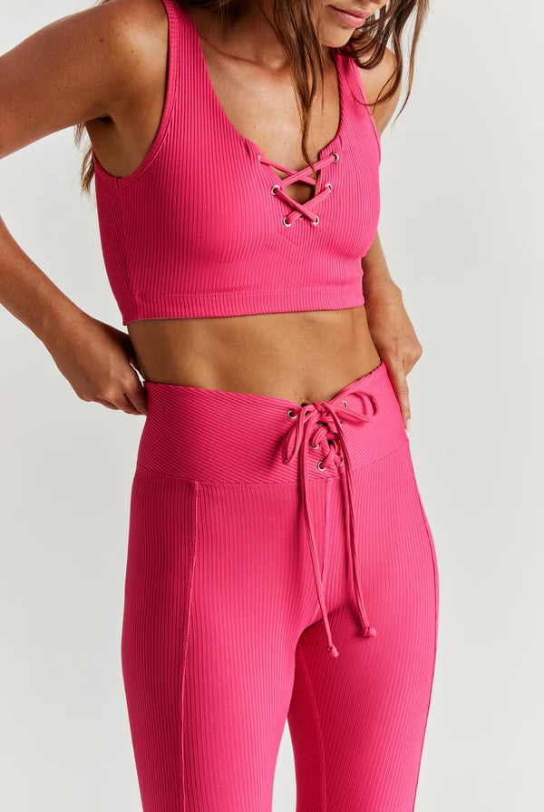 Our fan favorite silhouette. An angled high waist meets an adjustable lace-up front finished with vertical piping. In our Spandex Active Rib.