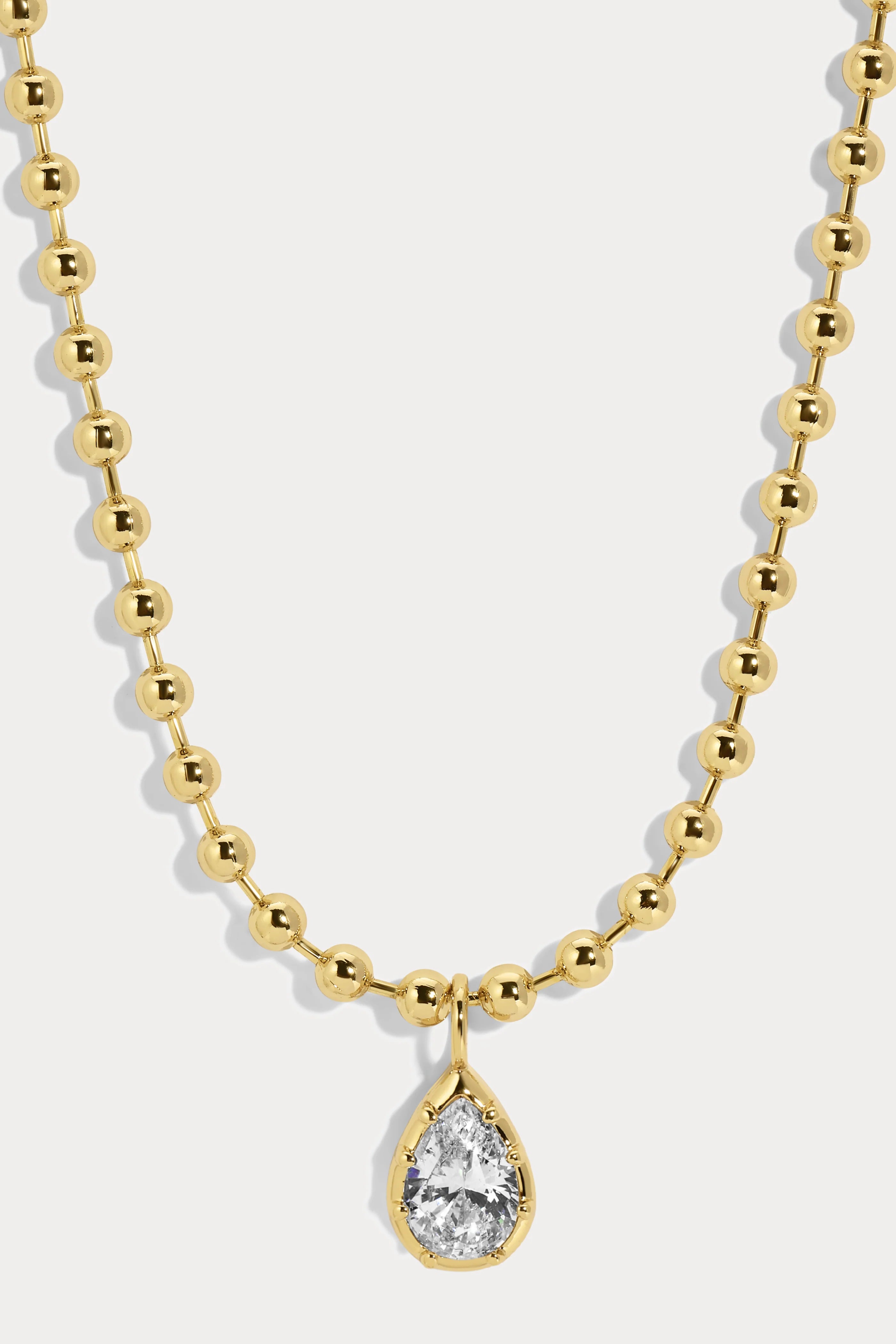 A FINE BALL CHAIN FINISHED WITH A RADIANT PEAR-SHAPED CZ PENDANT. EFFORTLESSLY UNDERSTATED YET STRIKING, THIS IS THE PIECE THAT WILL BECOME YOUR EVERYDAY GO-TO.