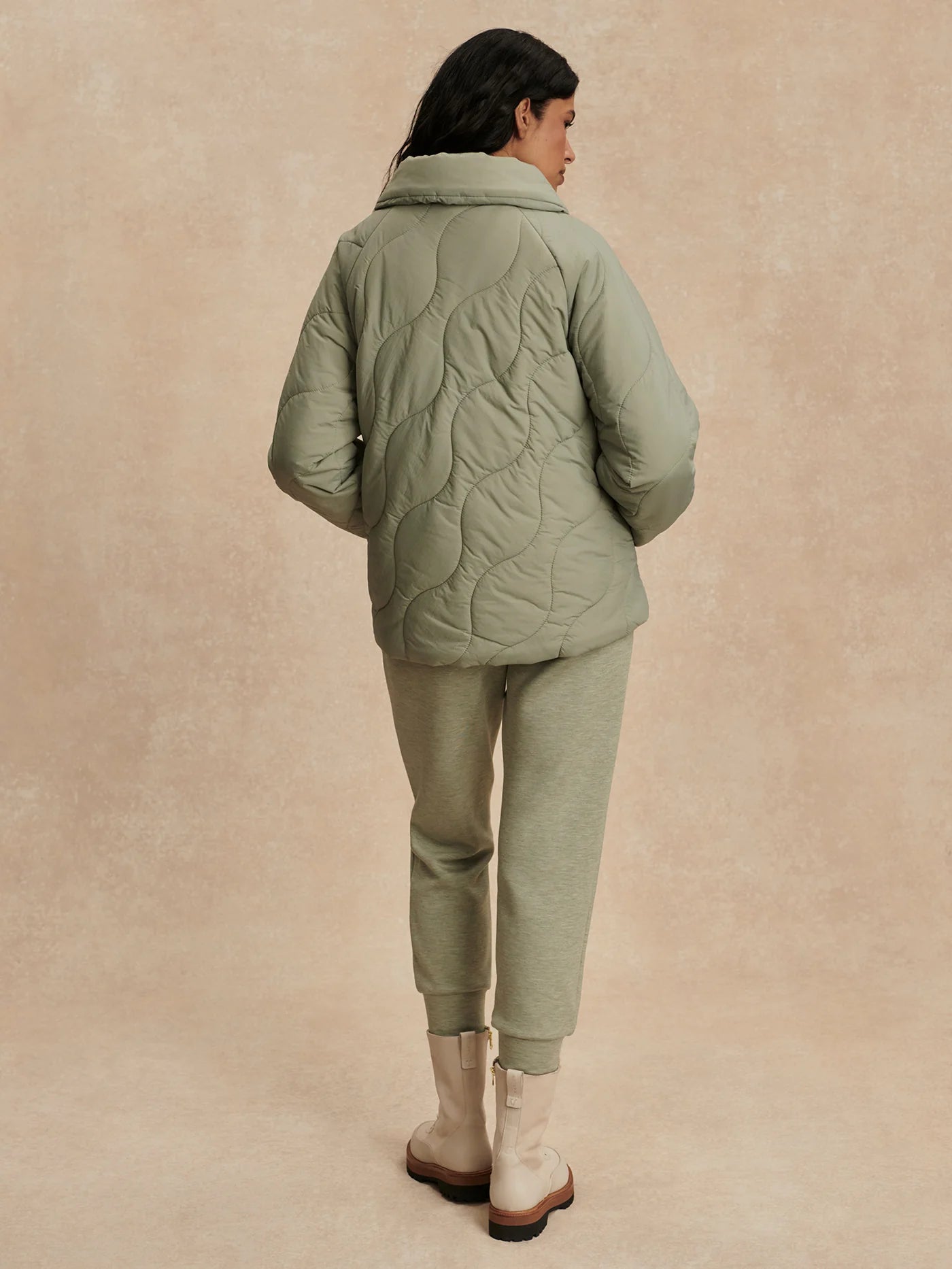 The Fabia delivers lightweight warmth in a relaxed, boxy shape - perfect for effortless layering over chunky knits. It's crafted from Superlight Soft Nylon in an elegantly angled onion quilt and features a high collar, curved hem with internal cinch, and easy snap-through fastening.