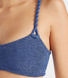 Give your beach days a bold refresh with the Phoebe Bikini in Metallic Denim by Hunza G. Featuring tonal twisted strap details and medium coverage briefs, this shimmering set brings a modern edge and standout style to your swimwear lineup. Picture from Ophelia