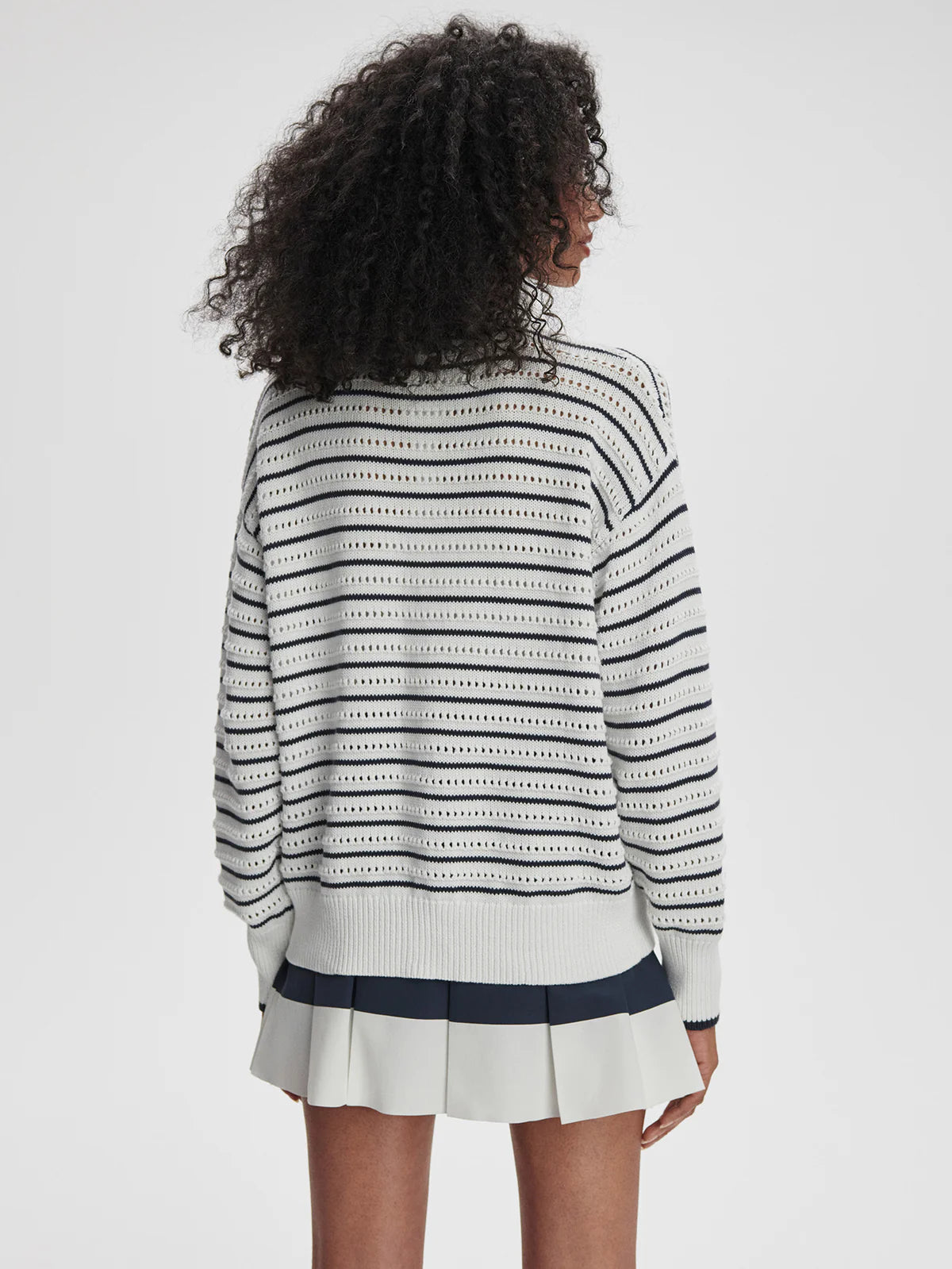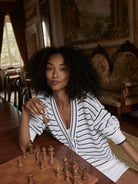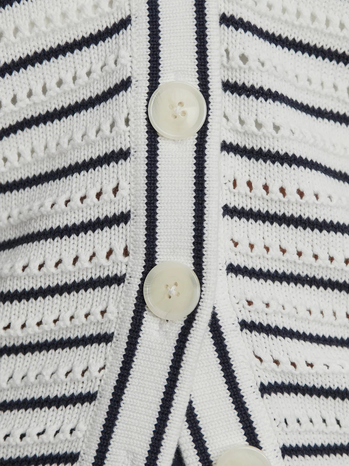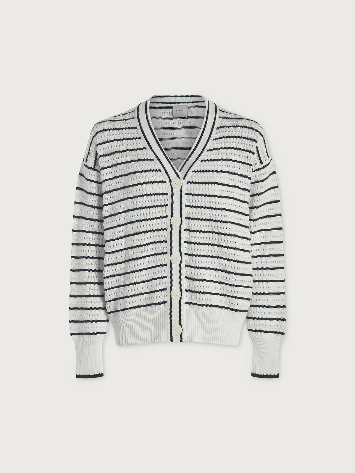 A soft fine knit crafted cardigan. Designed for a relaxed fit with dropped shoulders. Brought to life by a V-neckline. Detailed with contrasting stripes and ribbed hemline and cuffs.